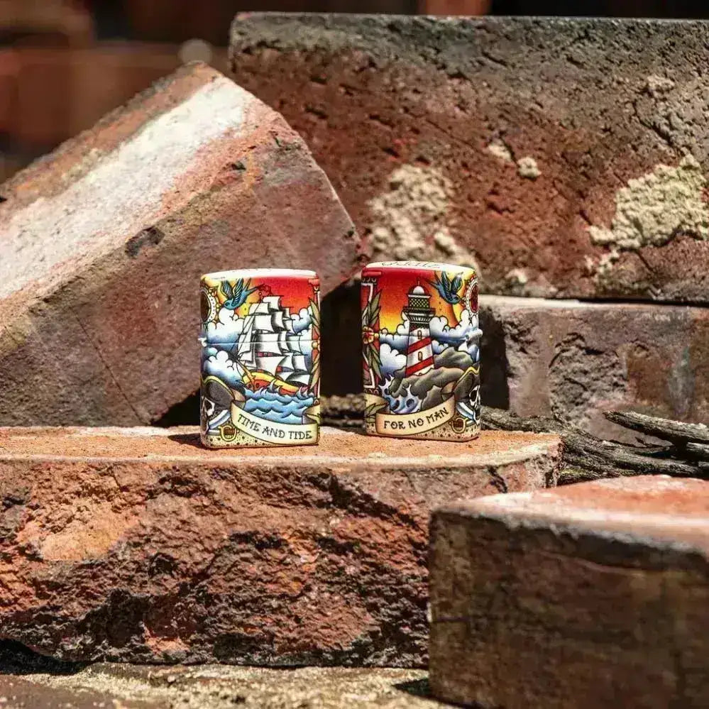 Así que suelta amarras e iza el foque, porque este Zippo con un elegante diseño de tatuaje de la vieja escuela es perfecto para tu colección o para un viejo marinero.