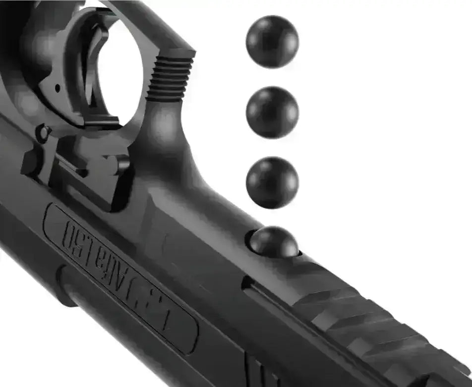 Se inserta 1 cartucho de Co2 de 12 g en la empuñadura de la pistola, luego se enrosca la tapa del cargador hasta que se siente que encaja en las roscas. Recuerde que la tapa de la revista debe estar en posición abierta. Luego cargue 7 balas calibre 50 en el cargador interno debajo del cañón. Para activar el cartucho de Co2, dale El arma dio un ligero golpe en la tapa del cargador. ¡Ahora el arma está lista para disparar al blanco!