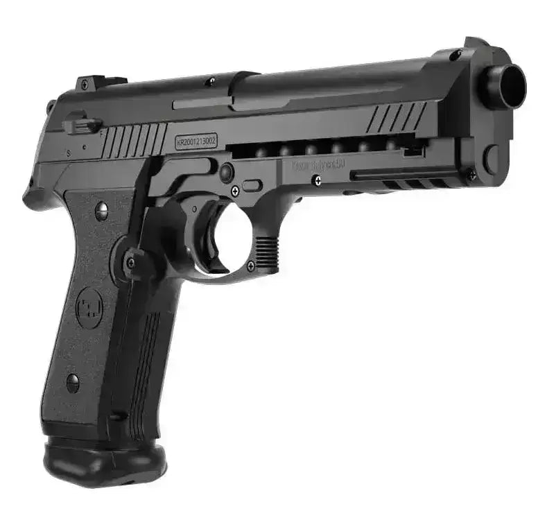 ¡Esta resistente pistola de entrenamiento calibre .50 dispara a una velocidad inicial de unos poderosos 380 fps! El diseño del marcador se basa en la clásica pistola italiana Beretta M92. Estructuralmente está construido sólidamente y tiene pocas partes móviles, lo que contribuye a la confiabilidad y larga vida útil del marcador.