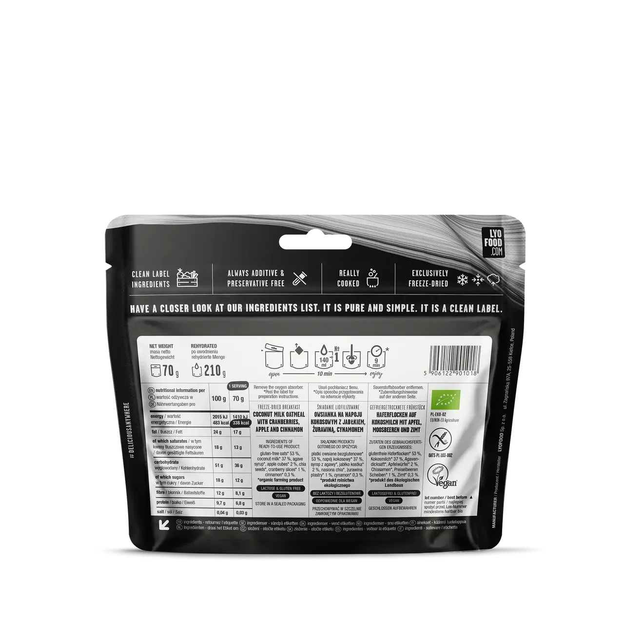 En deilig, høstinspirert frokost med smak av søte epler, kanel og kokosmelk. LYOFOODs Apple & Cinnamon Porridge er laget av økologiske og naturlige ingredienser – uten kunstige tilsetningsstoffer. Rik på fiber og langsomme karbohydrater, og perfekt for friluft, hytte eller beredskap.