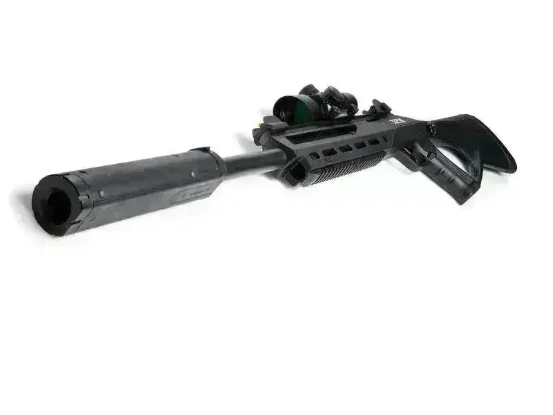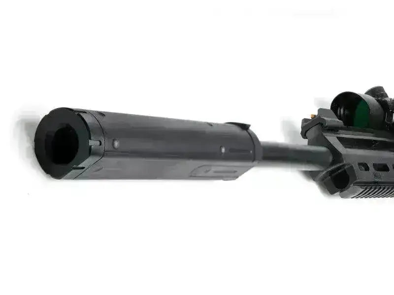 Complete su rifle TAC con este silenciador especialmente diseñado. Gracias a un corte plano horizontal en la parte inferior del silenciador, podrás utilizar el láser TAC sin que el silenciador entre en conflicto con el rayo láser. ¡El supresor es fácil de instalar y hace que el rifle luzca mucho más genial que sin él! ¡Se adapta bien a las versiones de 6 mm y 4,5 mm!