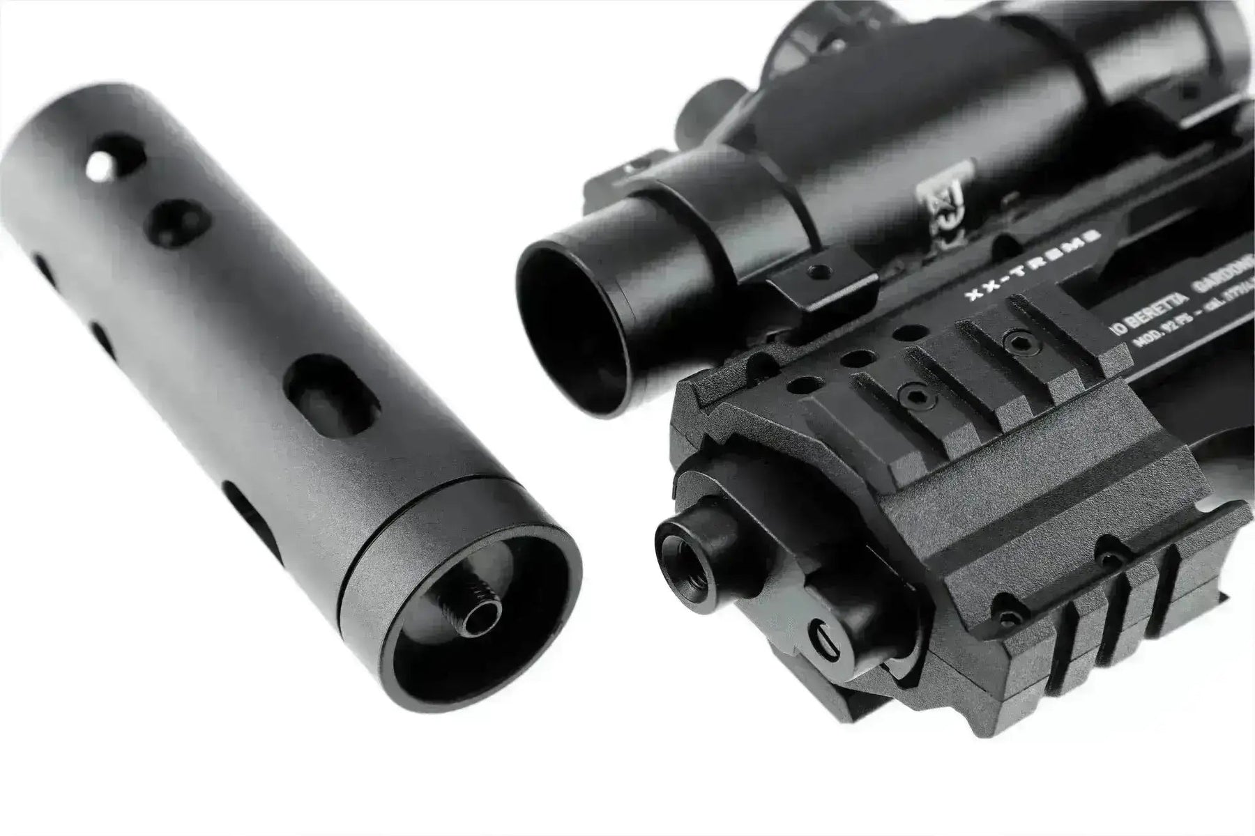 Fabricada bajo licencia por la propia Beretta, esta réplica del M9 es un placer para disparar. Los disparadores de acción simple y doble combinados con un cañón de acero estriado proporcionan una precisión excelente y el arma viene con un riel de montaje para un punto rojo y una mira de punto rojo. Moderador incluido.