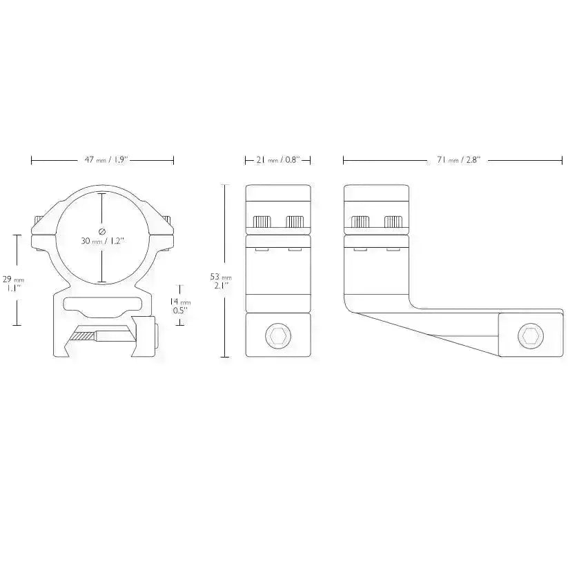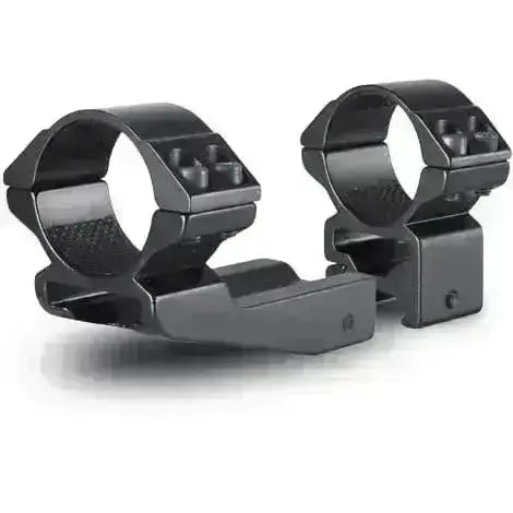 Soportes de aluminio con superficie anodizada en negro. Los anillos de montaje tienen un revestimiento suave y fino en el interior que mantiene la óptica firmemente en su lugar y evita que se raye.  Los anillos de montaje son altos para dejar espacio para ópticas más amplias y encajan bien con binoculares un poco más grandes.