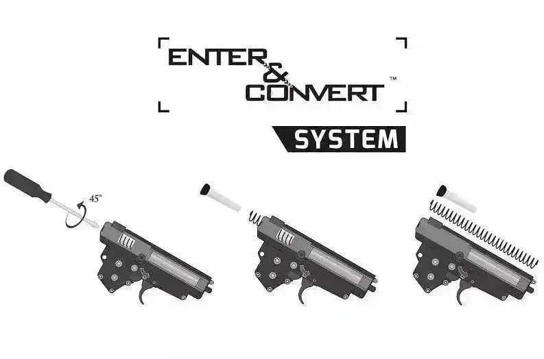 Nada más sacarlo de la caja, este rifle produce 380 fps. Perfecto para distancias medianas. Si va a jugar en interiores / CQB, le recomendamos cambiar al resorte M90 suministrado, entonces se reducirá a alrededor de 310 fps. Esto es fácil, gracias al sistema Enter y Convertir, lo que le permite cambiar plumas en unos minutos sin tener que desmantelar todo el rifle.