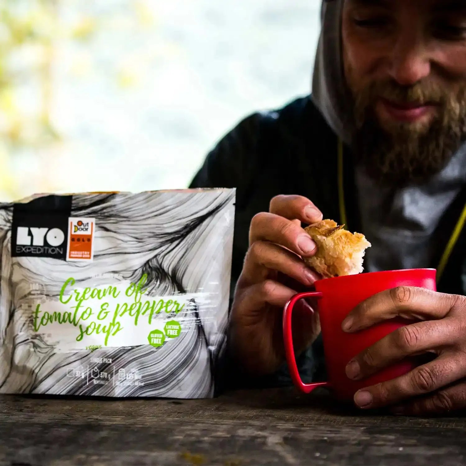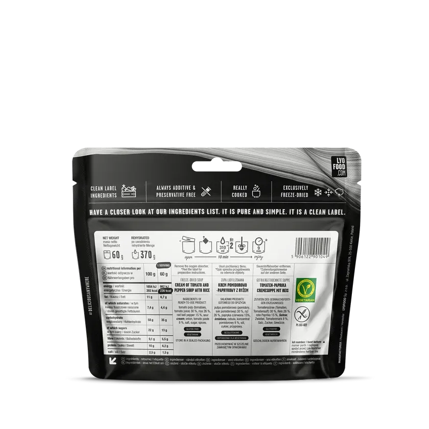 LYOFOOD Creamy Tomato & Pepper Soup kombinerer moden tomat og rød paprika i en kremet og varmende suppe. Laget med 100 % naturlige ingredienser, helt uten gluten og kunstige tilsetningsstoffer. Perfekt som lett middag, mellommåltid eller forrett på fjelltur, camping eller ekspedisjoner der rask energi og god smak er viktig.