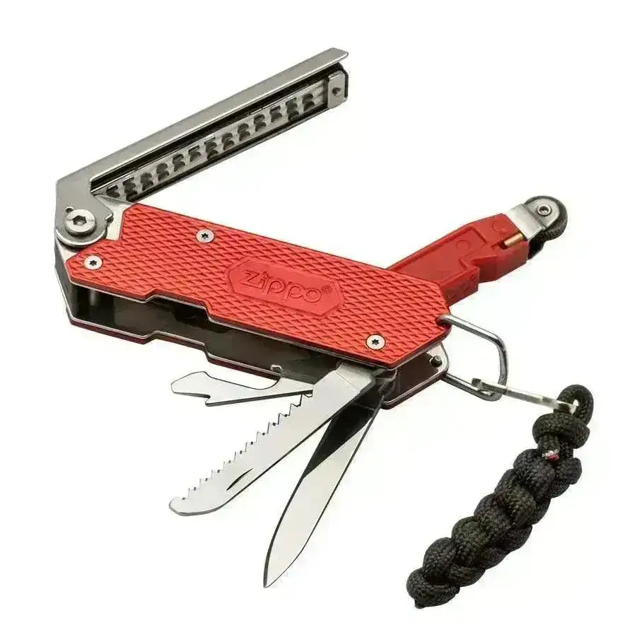 Todas las cosas habituales que esperarías de una multiherramienta/navaja de bolsillo, pero con un toque de estilo; ¡Todo lo que necesitas para encender un fuego! Perfecto para senderismo y ocio, esencial para la supervivencia. La herramienta multiusos para encender fuego Zippo le brinda la posibilidad de iniciar un fuego con una escofina para madera, una cuerda encerada y una rueda de pedernal. Además, la multiherramienta cuenta con todos los elementos habituales para ayudarte también.