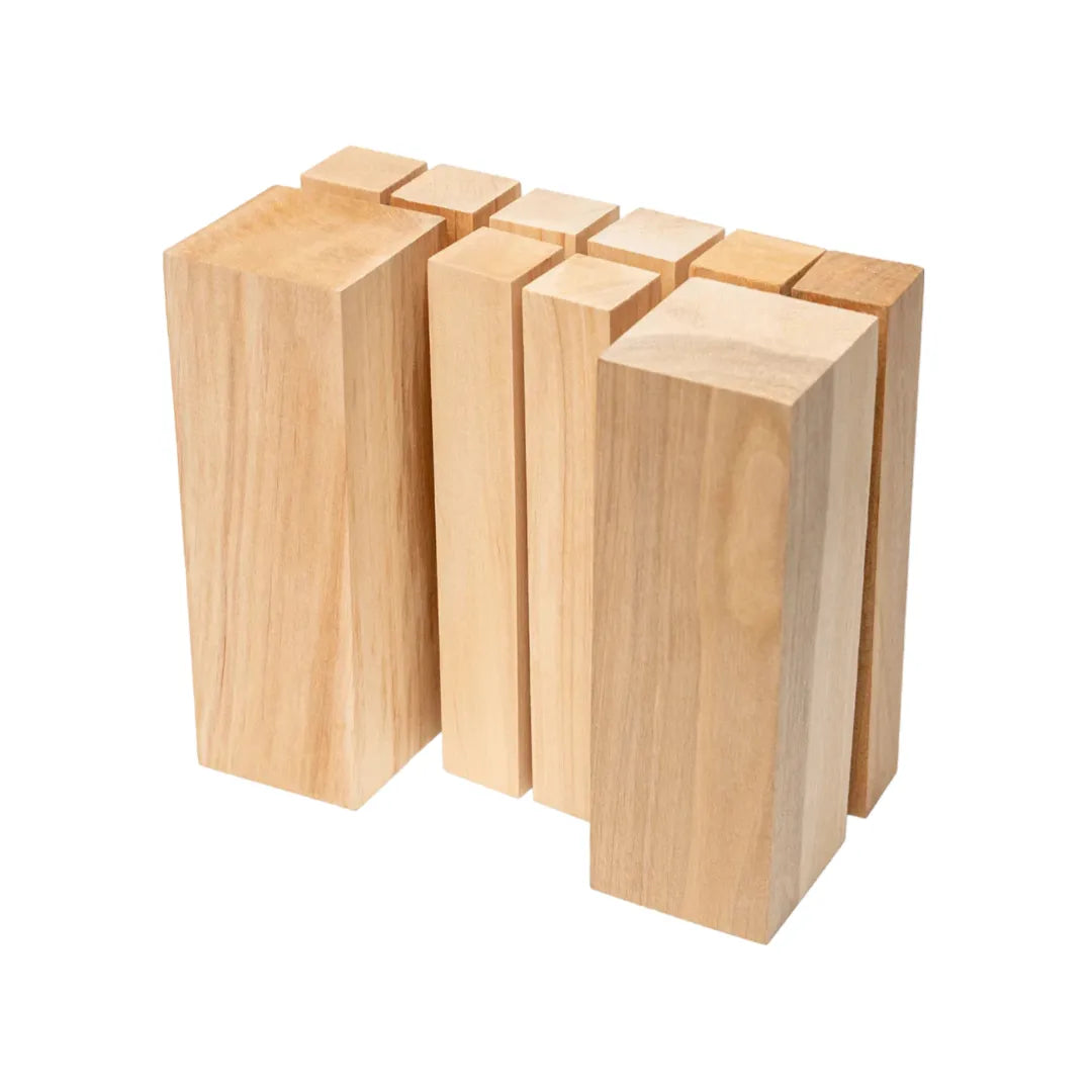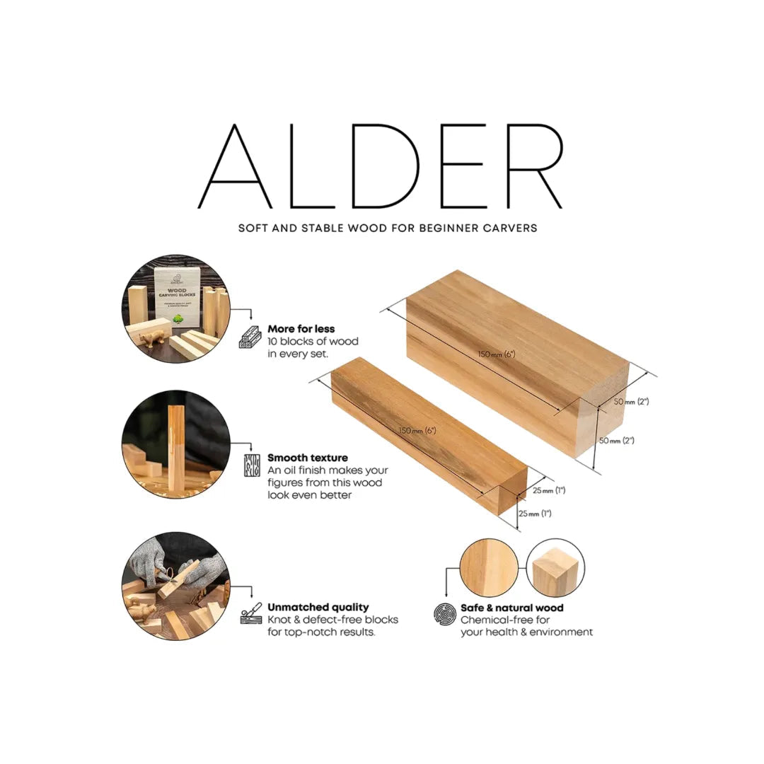 BW10 El juego de bloques de corte Alder es perfecto para los entusiastas del bricolaje. El juego incluye 10 bloques de madera natural de aliso (Alder) fáciles de tallar. Con su superficie lisa y lijada, los bloques son ideales para diseños precisos y pueden pintarse o teñirse para adaptarse a diferentes proyectos.
