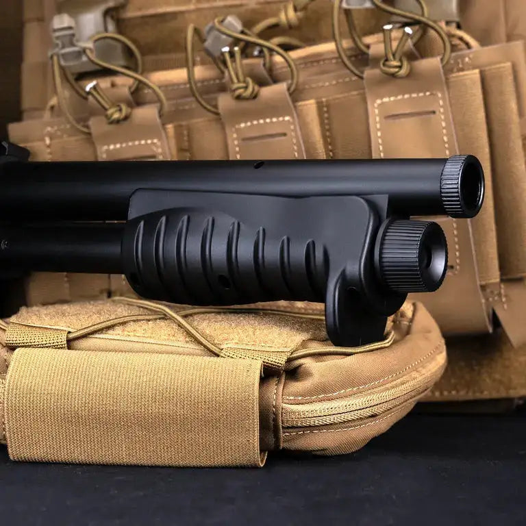 Hagla er utstyrt med en 21mm picatinny-skinne på toppen, slik at du enkelt kan montere rødpunktsikte, lykt eller annen taktisk optikk. Grepet er teksturert for bedre kontroll, og pumpen er utformet med fingerstopp for rask og presis repetisjon.
