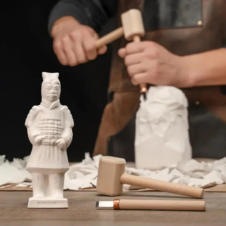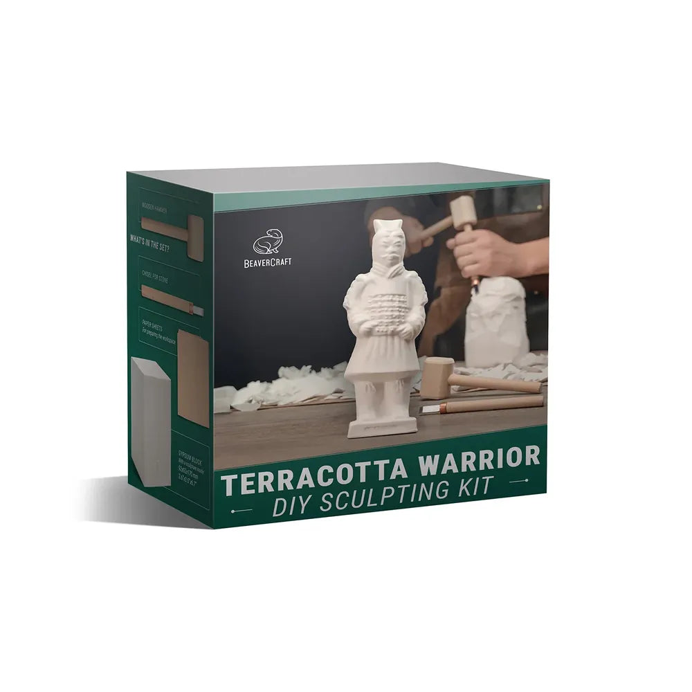 Terracotta Warrior DIY skulptursett lar deg meisle frem en ferdig polymerfigur inspirert av Kinas berømte terrakottahær. Figuren ligger skjult inne i en gipsblokk og kommer gradvis frem mens du arbeider med hammer og meisel.