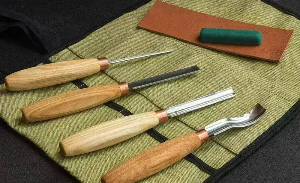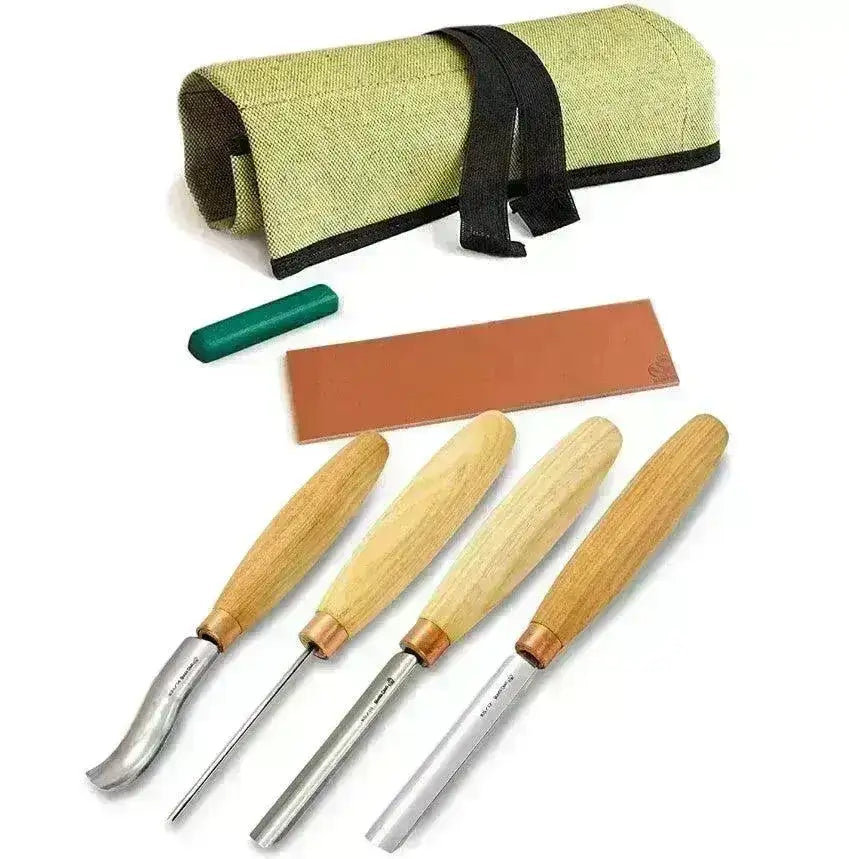 Herramientas para tallar madera hechas a mano en Ucrania. El juego SC01 es perfecto para quienes desean el equipo adecuado para dar forma y tallar hermosos motivos en su proyecto de madera. Obtendrás un rollo de lona con 4 hierros diferentes, las hojas están hechas de acero al carbono que se mantiene afilado durante mucho tiempo. Estas gubias hechas a mano están afiladas y listas para usar desde el primer momento.