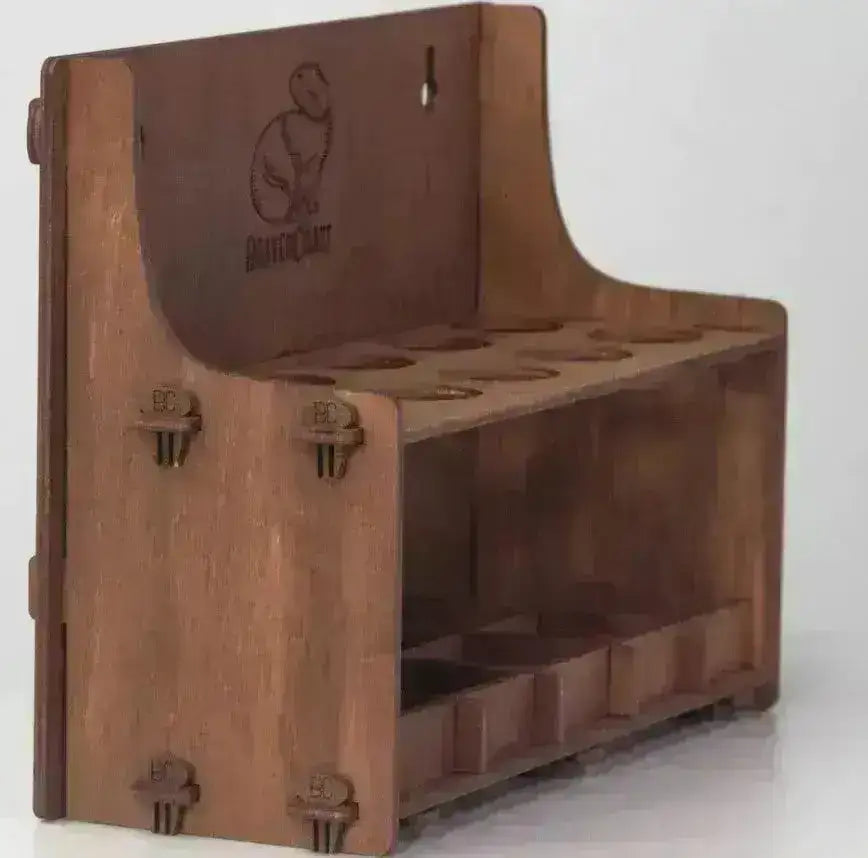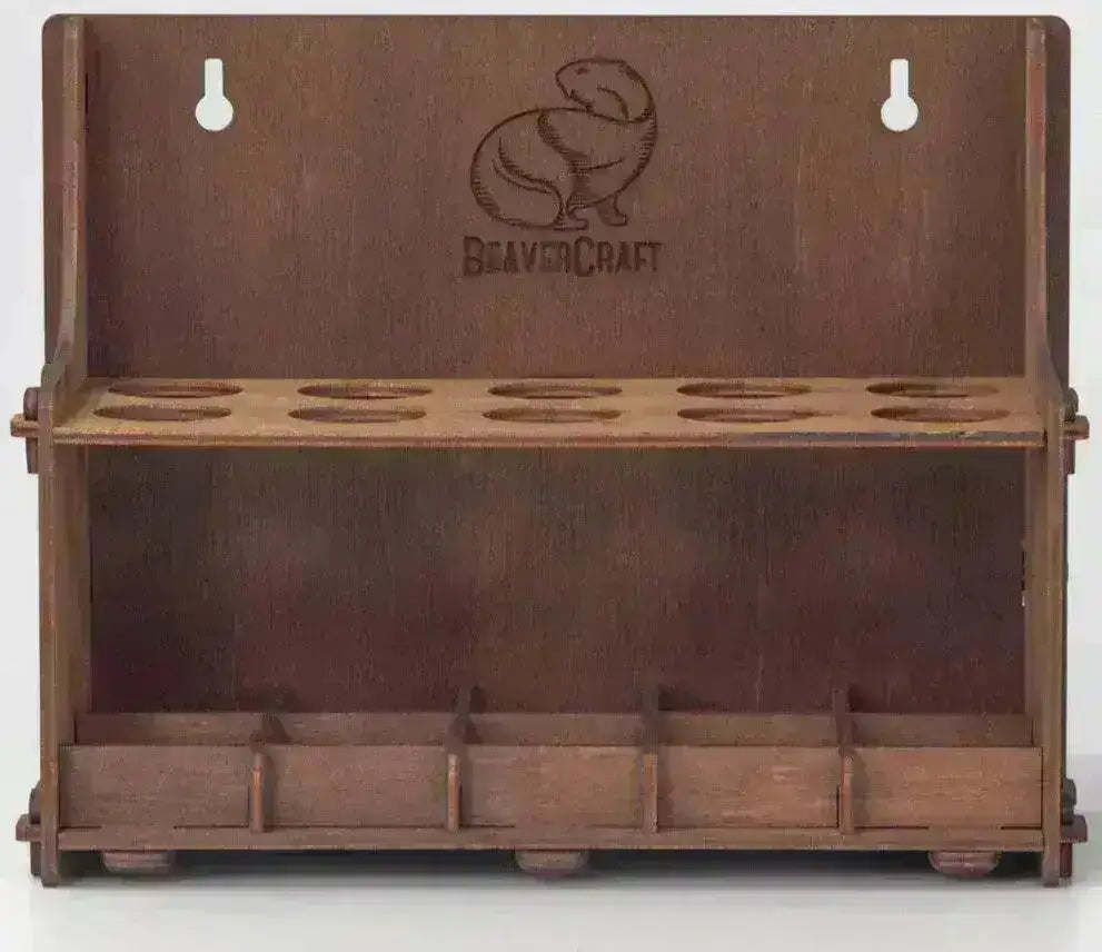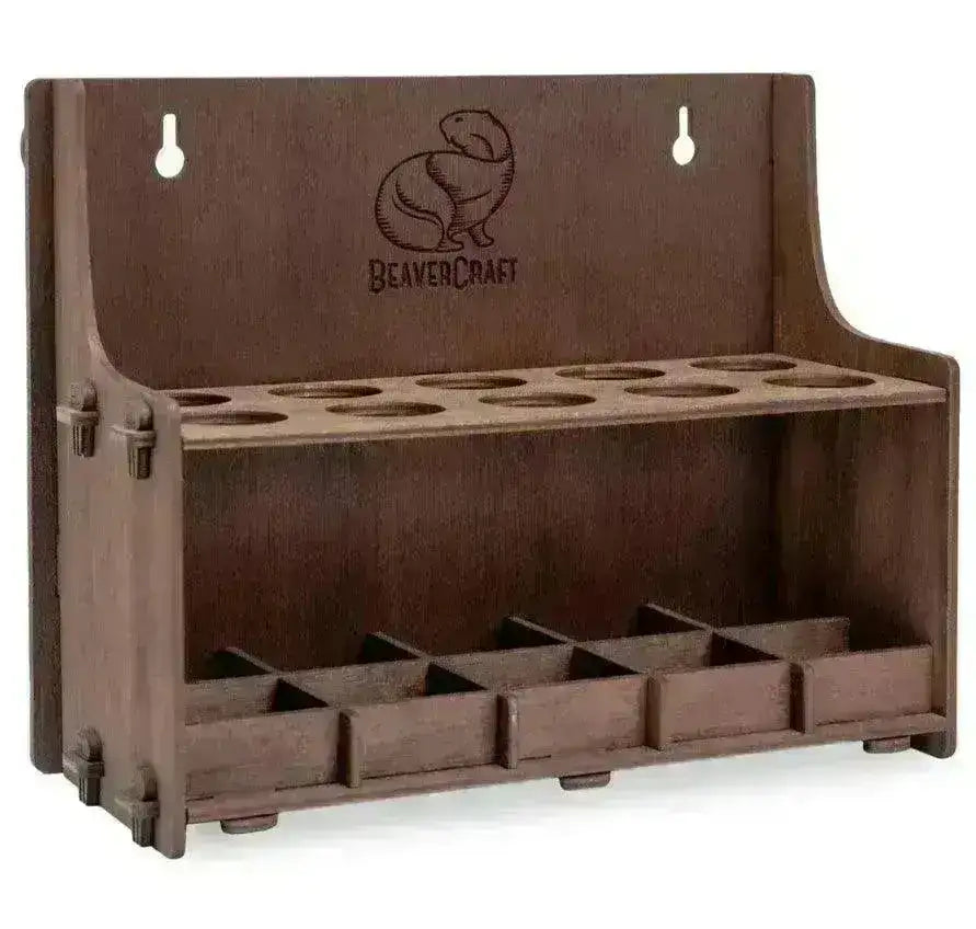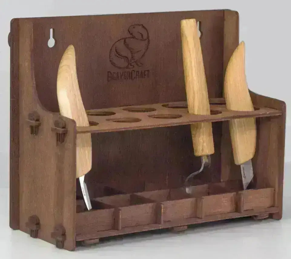 Un gran estante para herramientas para cuchillos y similares. Perfecto para colgar en la pared o colocarlo sobre el banco de trabajo. Gran acabado oscuro.