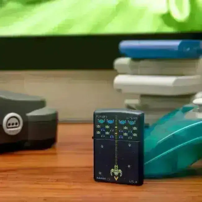 Zippo de juegos retro para jugadores y cualquier persona que ame las cosas retro: fondo azul marino mate con impresión de juego de píxeles