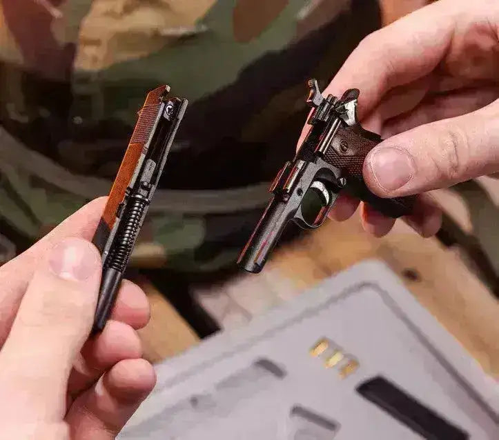 Pero espera, ¡hay más! La Mini 1911 no es sólo un modelo estático; También tiene partes funcionales como la corredera, el gatillo y cargadores intercambiables. Así que ahora podrás sentirte como un verdadero experto en armas mientras te sientas en tu cómodo sillón y juegas con tu pequeña réplica (pero no intentes dispararle: después de todo, es solo un modelo).
