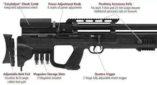 En la parte inferior de la culata hay espacio para colocar 3 cargadores de repuesto, lo que hace que la recarga sea aún más rápida. La potencia del rifle se puede ajustar fácilmente con la rueda en el costado de la caja de seguridad, lo que le permite ajustar la presión según sus necesidades ya sea que esté disparando a distancias cortas o largas.
