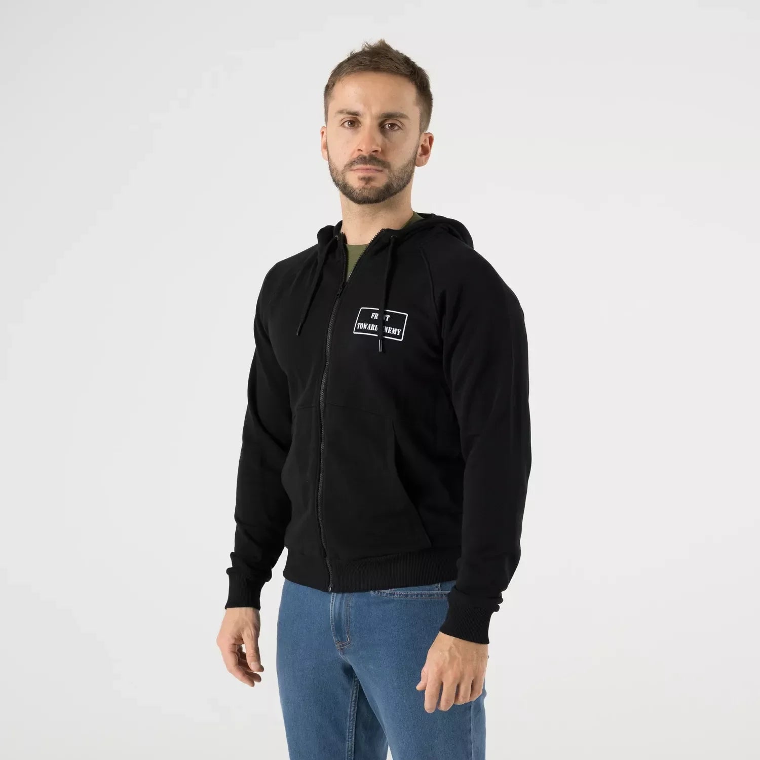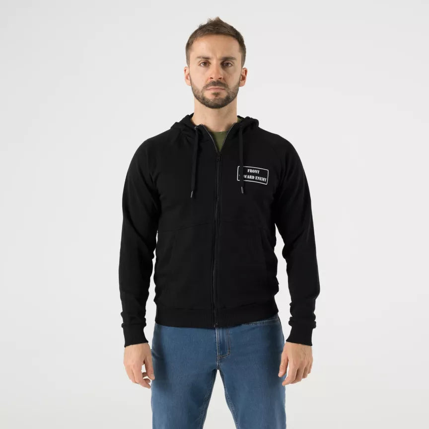 Denne Front Toward Enemy hoodien er en lett og behagelig hettegenser laget for daglig bruk. Den har hel glidelås, justerbar hette og to romslige hoftelommer. Praktisk når du vil ha en enkel genser som funker i byen, på reise og til pendling.