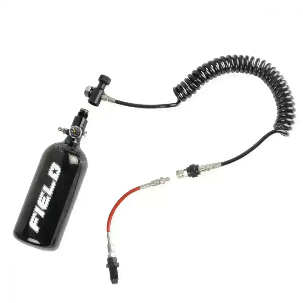 Configuración sencilla: conecte el tanque a la manguera y luego conecte la manguera al rifle. Por ejemplo, el tanque se puede almacenar en una mochila, lo que permite utilizar el rifle como un PCP de aire comprimido sin tener un tanque en el camino. Con este conjunto no solo obtendrás más disparos por llenado, sino que los disparos también serán más precisos.