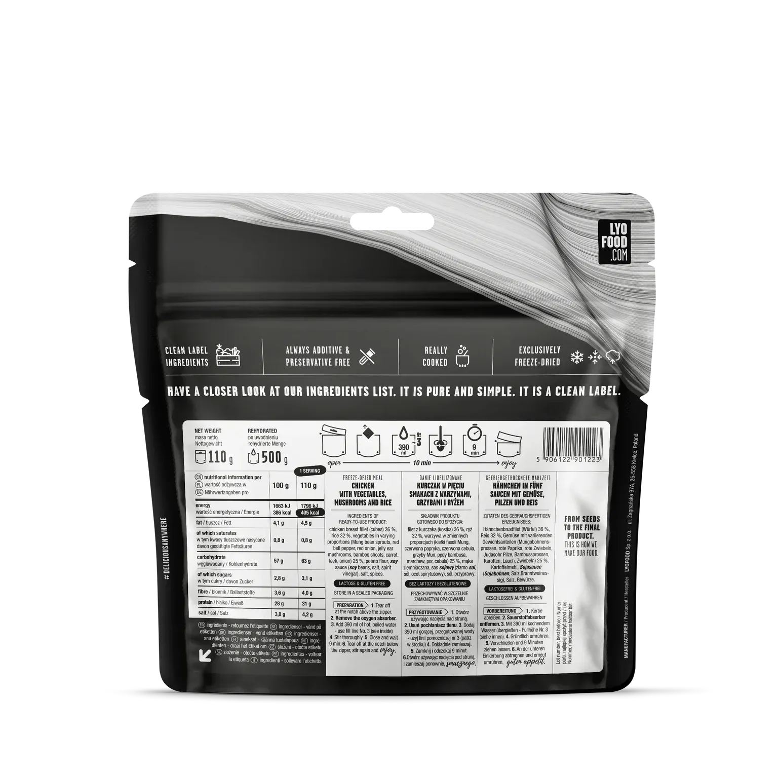 Ta med deg smaken av Asia på tur! LYOFOOD Kylling med femkrydder kombinerer saftig kylling med grønnsaker og en rik blanding av tradisjonelle kinesiske krydder. 100 % naturlige ingredienser, ingen konserveringsmidler, frysetørket for ekstremt lav vekt og lang holdbarhet. Perfekt for eventyrere som ønsker variasjon og smaksrikdom på ekspedisjonen.