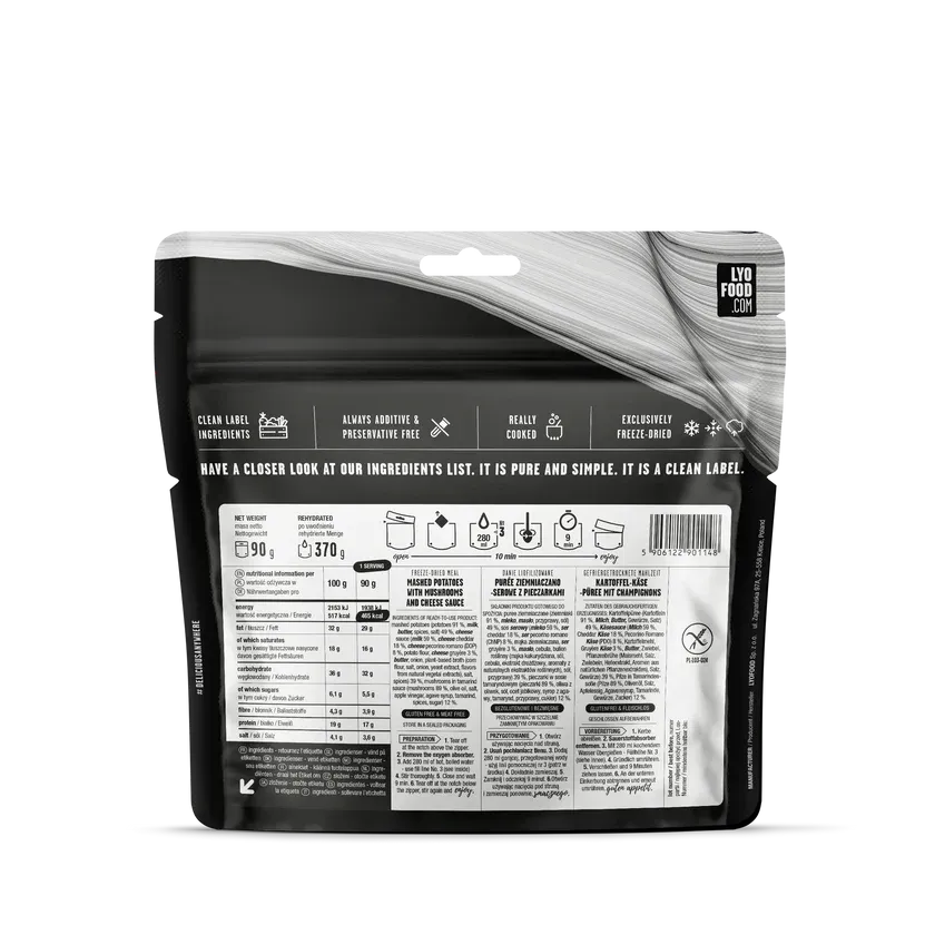 LYOFOOD Mash & Cheese kombinerer myk potetmos med smeltet ost for å gi en varm og mettende middag uansett hvor du er. Laget med 100 % naturlige ingredienser, uten gluten eller kunstige tilsetninger. Denne glutenfrie, vegetariske retten er perfekt for fjellturer, ekspedisjoner og campingturer hvor enkelhet og energi teller.