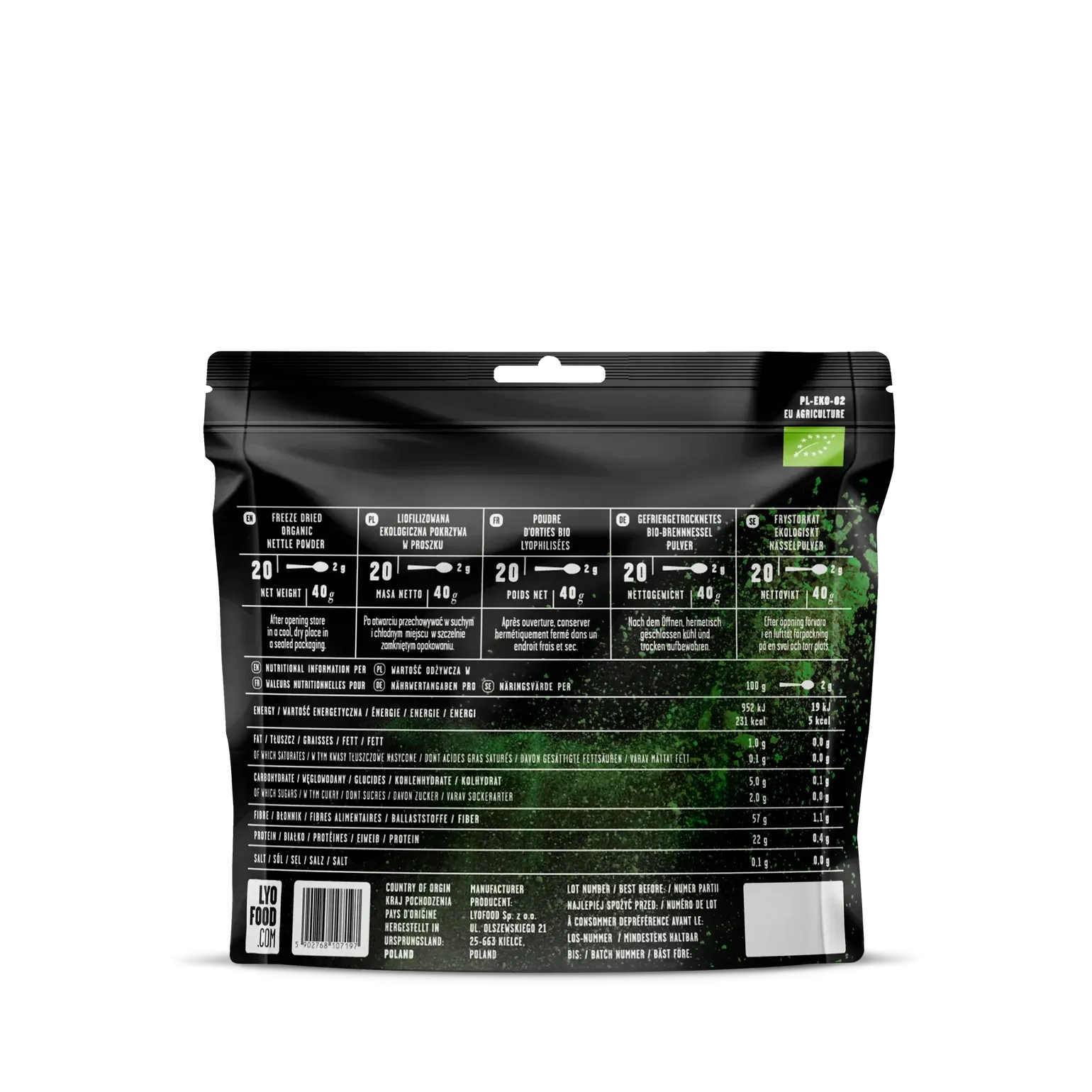 LYOFOOD Nettle Powder gir deg alle fordelene fra nesle, skånsomt tørket og malt til et praktisk pulver. Rik på jern, kalsium, vitamin C og fiber, perfekt for å styrke kostholdet naturlig. Brukes i smoothies, supper, urtedrikker eller baking. 100 % økologisk, uten tilsetningsstoffer, med lang holdbarhet og lav vekt.