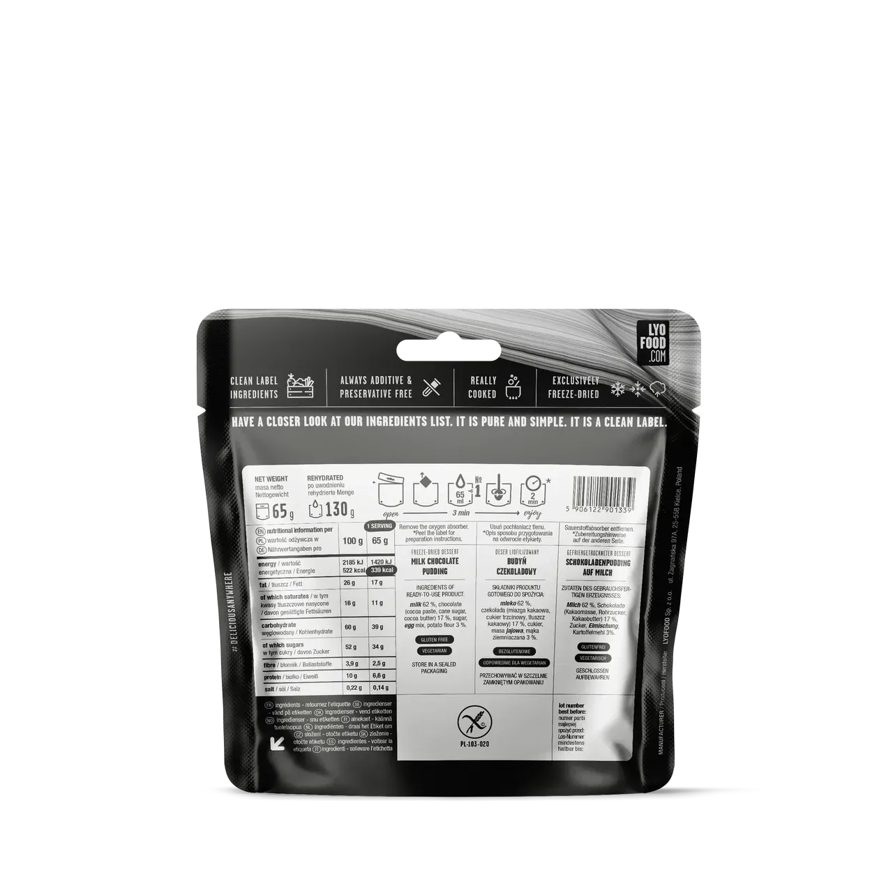 Alle små og store seire fortjener en belønning – og denne sjokoladepuddingen leverer. Laget med 62 % melk, ekte sjokolade og egg, er dette en rik, fyldig og glutenfri dessert du kan nyte hvor som helst. Enkel å tilberede og perfekt å kombinere med LYOFOODs frysetørkede bærmiks. En populær dessert blant både barn og voksne.