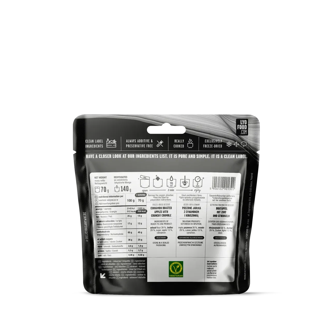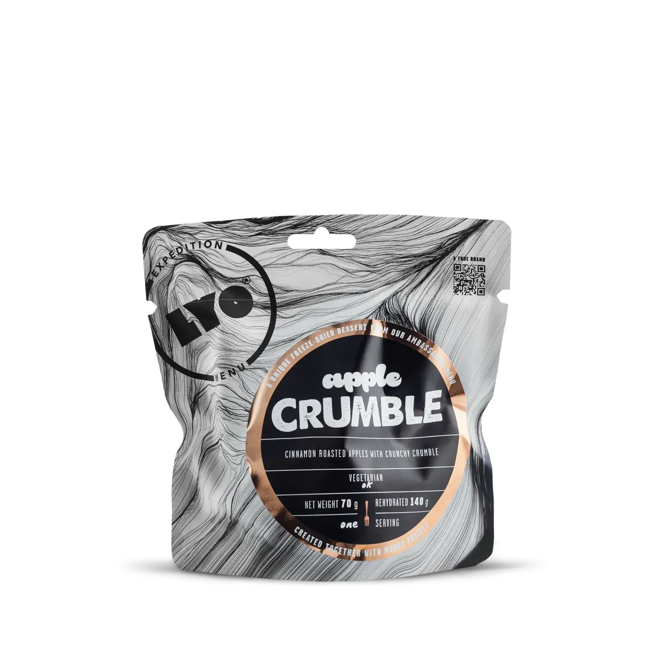 Marko Prezeljs favorittdessert! Denne frysetørkede epledesserten er laget med kanelbakte epler og sprø smuldretopp – inspirert av hjemmelaget eplekake. Perfekt når du vil ha noe søtt og tilfredsstillende etter et måltid, selv i fjellheimen. Bruk mindre vann for ekstra sprøhet. En del av LYOFOODs prisbelønte ekspedisjonsserie.
