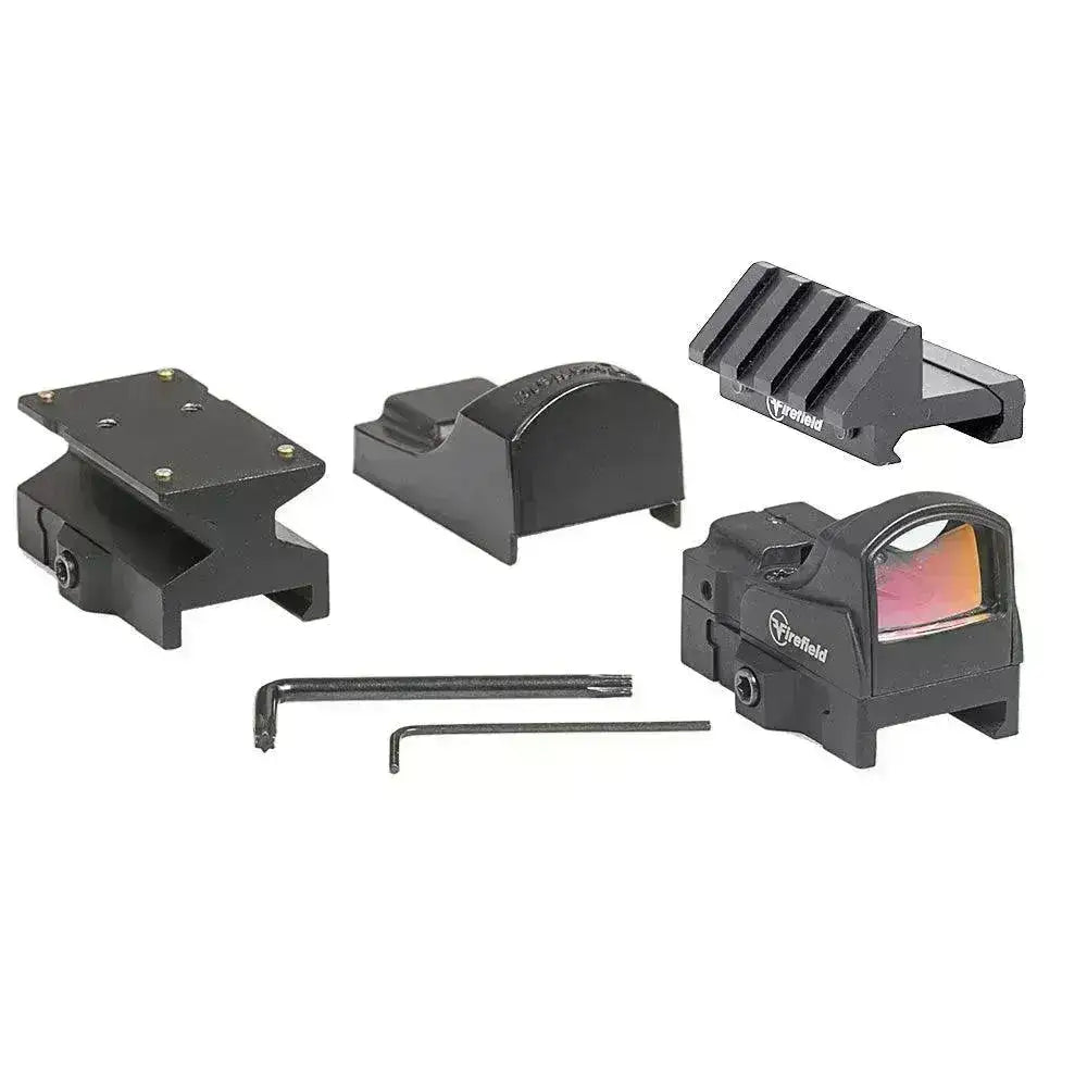 Este punto rojo está construido de aluminio sólido con un cuerpo de perfil bajo. Se conecta directamente al soporte de 21 mm o a uno de los elevadores de mira incluidos o al riel desplazado 45 grados, la mira también se puede conectar directamente a la corredera de algunas pistolas que tienen opciones de montaje para ella.