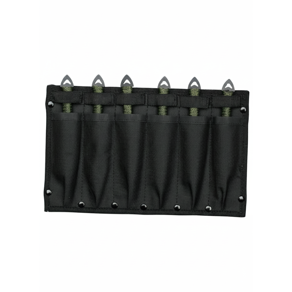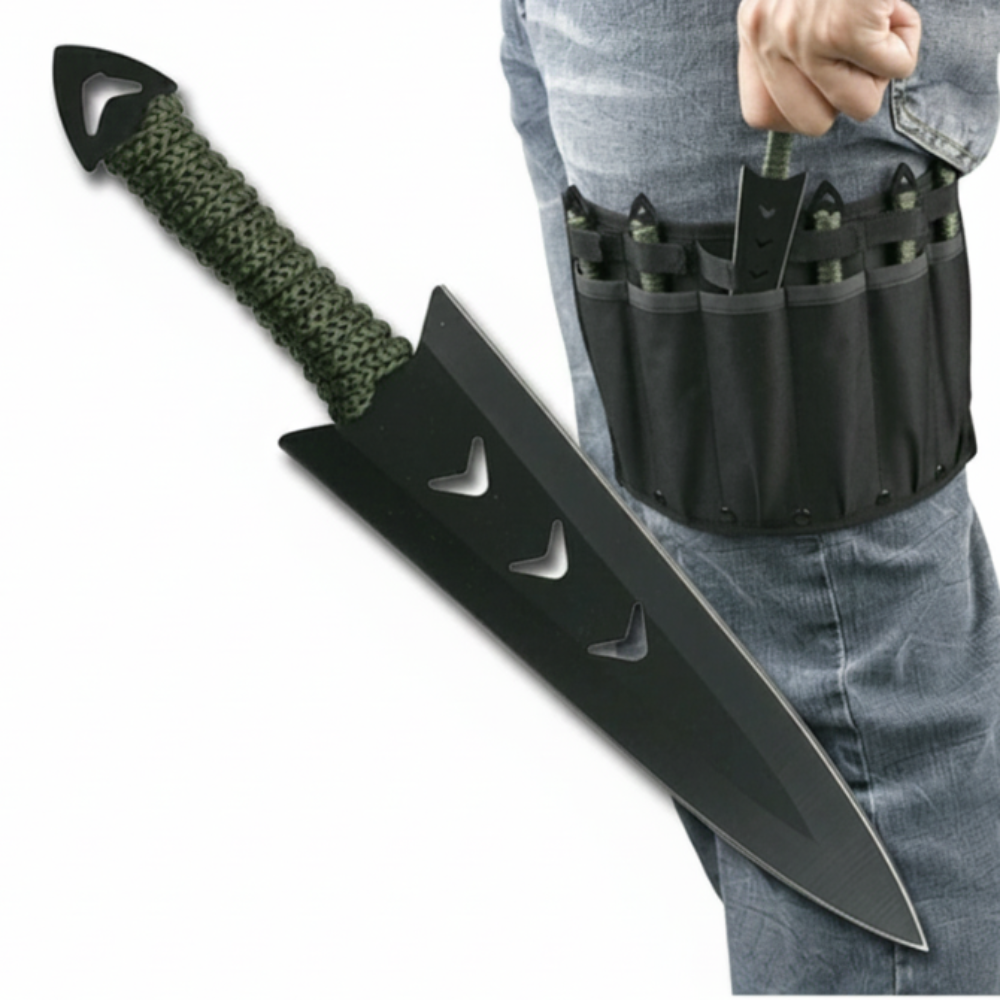 Knivene er konstruert i 3Cr13 rustfritt stål, et materiale som kombinerer god seighet med rustmotstand. Den svarte finishen på bladene gir dem et tøft, taktisk uttrykk, mens det grønne cord-wrap-grepet sørger for at kniven ligger stabilt i hånden før utkast. Dette er kniver bygget for "Target Sports", der balansepunktet er kritisk for resultatet.