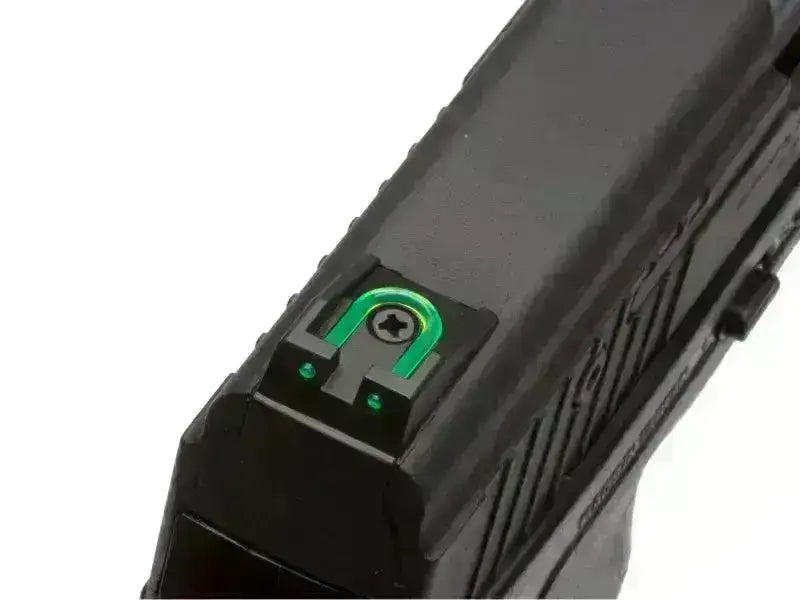 Las miras de hierro son de fibra óptica verde, lo que facilita la puntería. En la parte inferior del cañón hay un soporte de 21 mm para conectar una linterna o un láser si se desea.