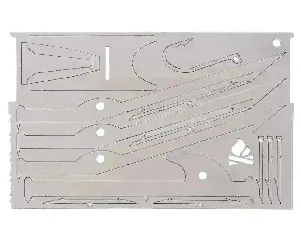 La tarjeta de supervivencia de Bushcraft Essentials no mide más de 12 x 7,3 cm y pesa 60 g. La tarjeta tiene varios tipos de anzuelos para peces y pequeños anzuelos de lanza que pueden resultar útiles en caso de emergencia cuando estás de viaje.