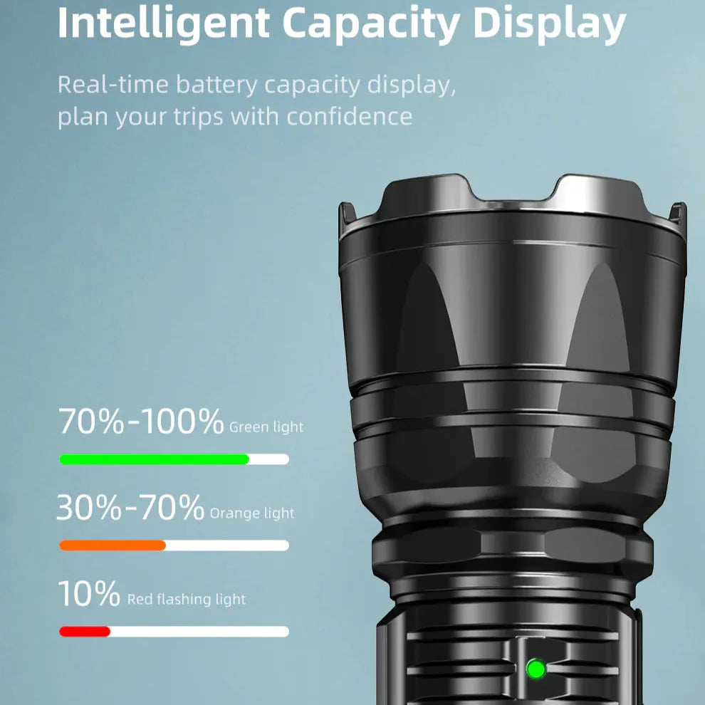 Utstyrt med one-touch aktivering, kan du raskt bytte mellom lysmoduser for optimal synlighet. Lommelykten støtter et bredt spenn av spenning fra 2,5V til 8,4V, noe som gjør den kompatibel med flere batterityper, inkludert 18650 og 21700 oppladbare batterier.