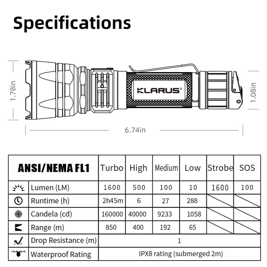 KLARUS XT12GT PRO er en kraftig taktisk lommelykt designet for krevende utendørsforhold. Med en imponerende lysstyrke på 1600 lumen og en ultralang rekkevidde på 850 meter, gir denne lykten eksepsjonell belysning for søk og redningsoperasjoner, jakt og patruljering i mørket.